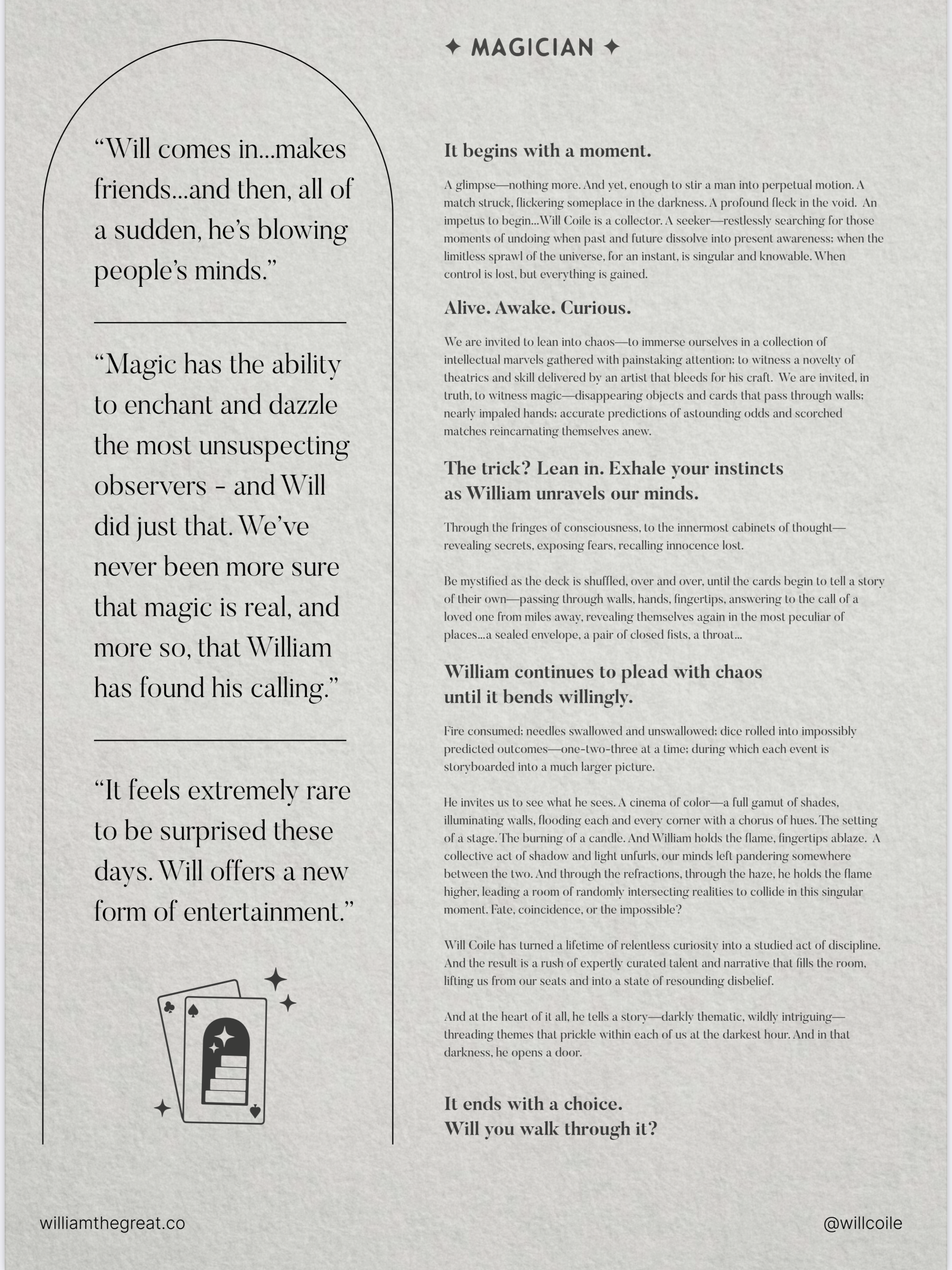 I was asked to assist a magician, thankfully in a way in which both halves of my body remained in tact. My aim was to use wordplay and creative direction to elevate the client’s act beyond a protracted string of card tricks, the banal fate of many performance industry magicians. Additionally, I provided him with consumer facing copy to use on and off the stage, having both professional and promotional uses. This included pitches of varying lengths, one sheet, biography, show description, scripting for his show with what we called ‘vignettes’ (see below), taglines, and imaginative pieces to develop a marketable universe surrounding his personal brand of magic.